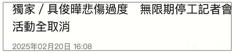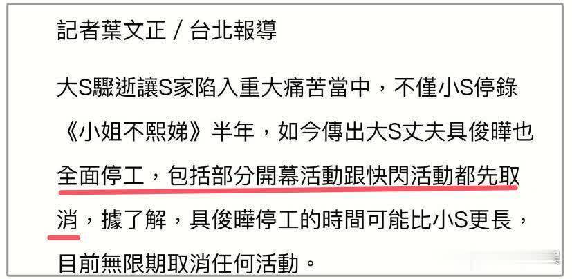 台媒称具俊晔因为悲伤过度,所以宣布全面停工,无限期取消任何活动。众所周知,此前小S也因为丧姐过度向《小姐不熙娣》请了半年假。如今具俊晔的停工时间居然比小S还要久,开幕活动和快闪活动都宣布取消了。
