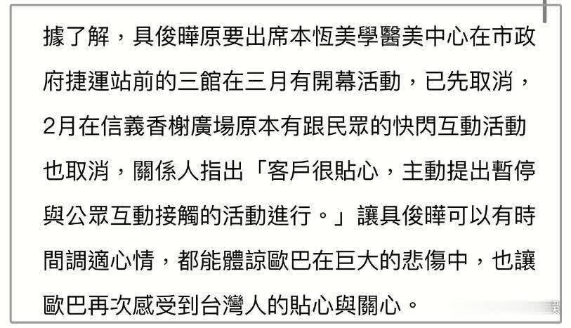 原来具俊晔本定在今年3月3日,将出席某医美中心的开幕活动,如今已经取消了。此外,原本具俊晔2月份将在台北信义香榭广场和民众有一场快闪的互动,如今也被取消了。